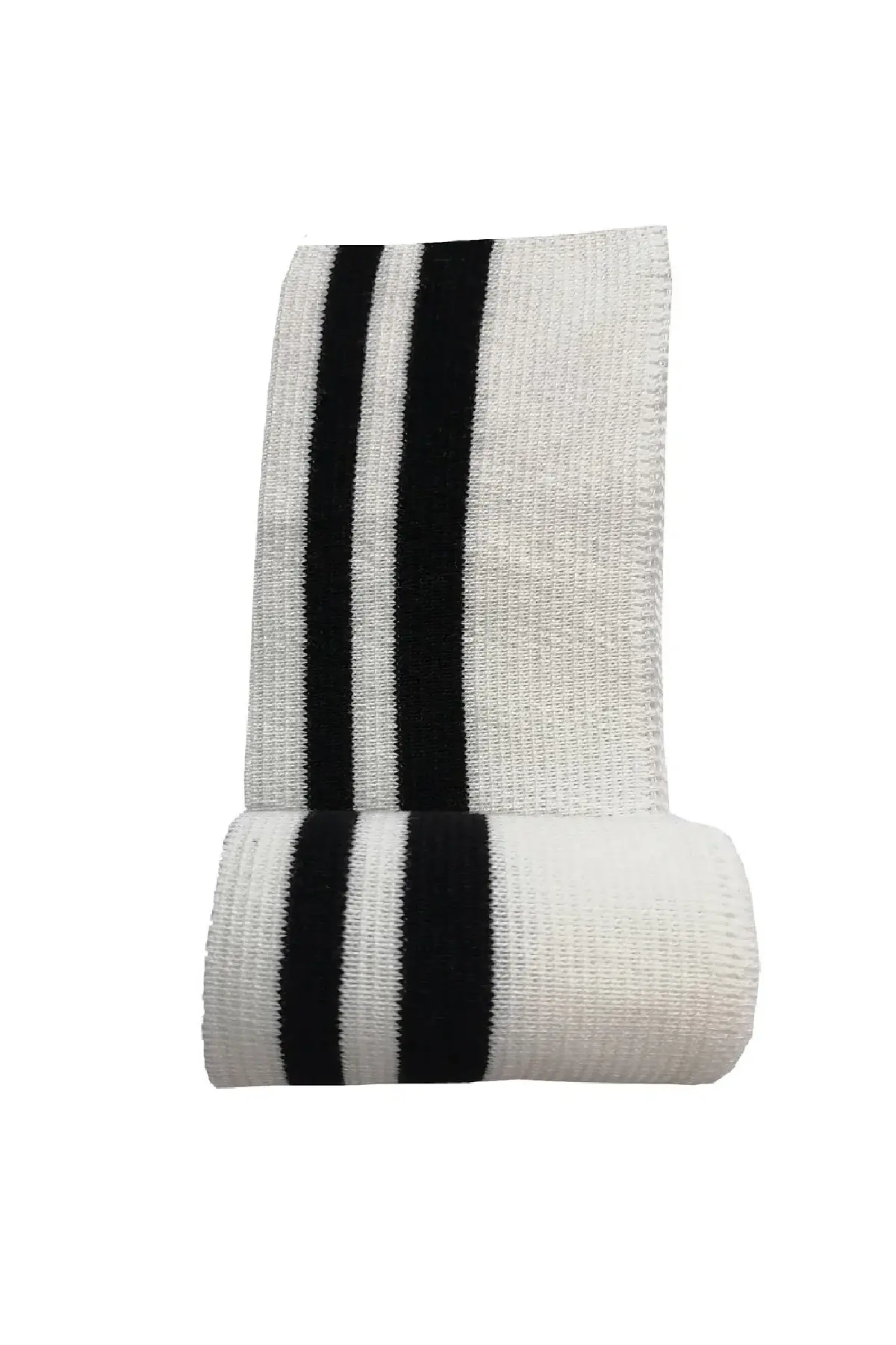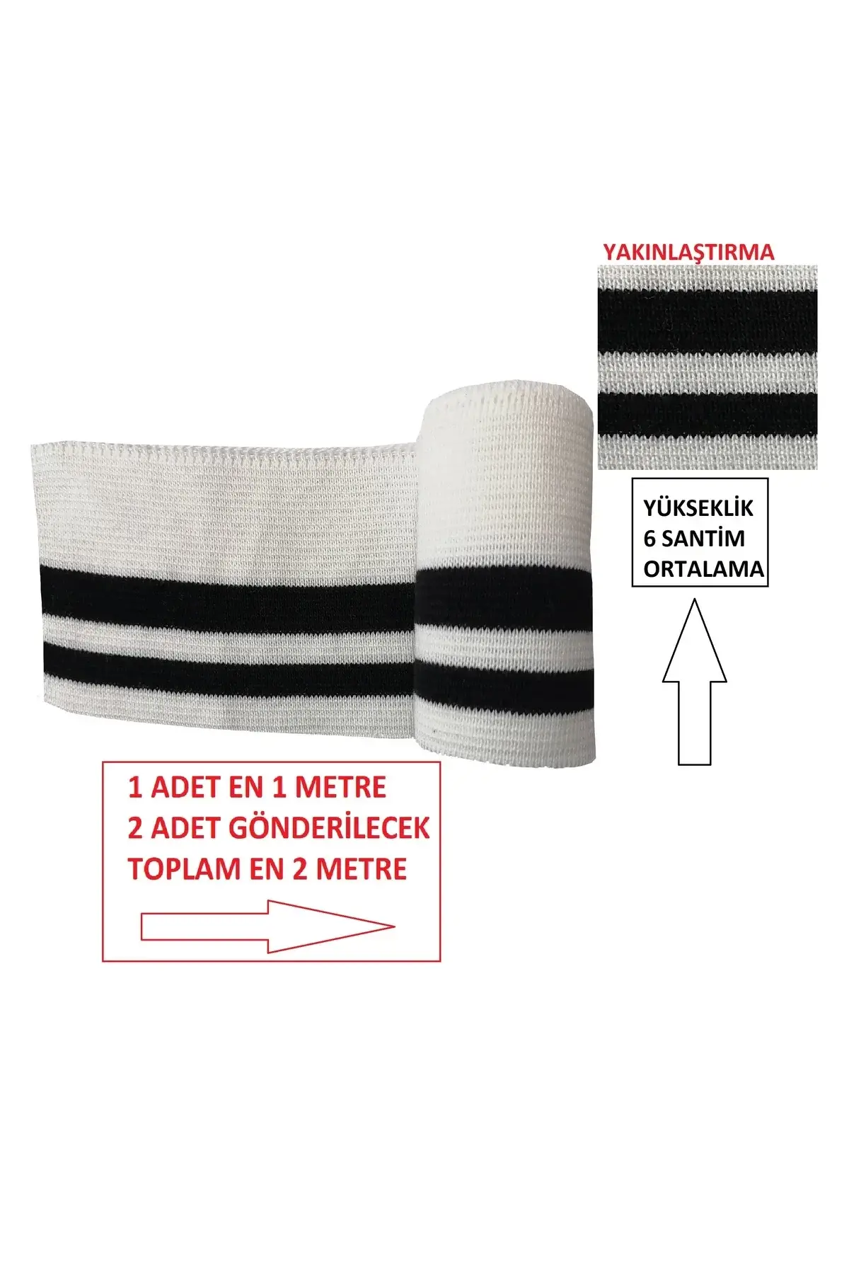 Triko dokuma yapısıyla üretilmiş bu ribana şerit, beyaz zemin üzerine siyah çizgili tasarımıyla sade ve modern bir görünüm sunar. Ürün 1 metre uzunluk ve 6 cm yükseklik ölçüsündedir. 2 adet olarak gönderilir, toplamda 2 metre uzunluktadır.