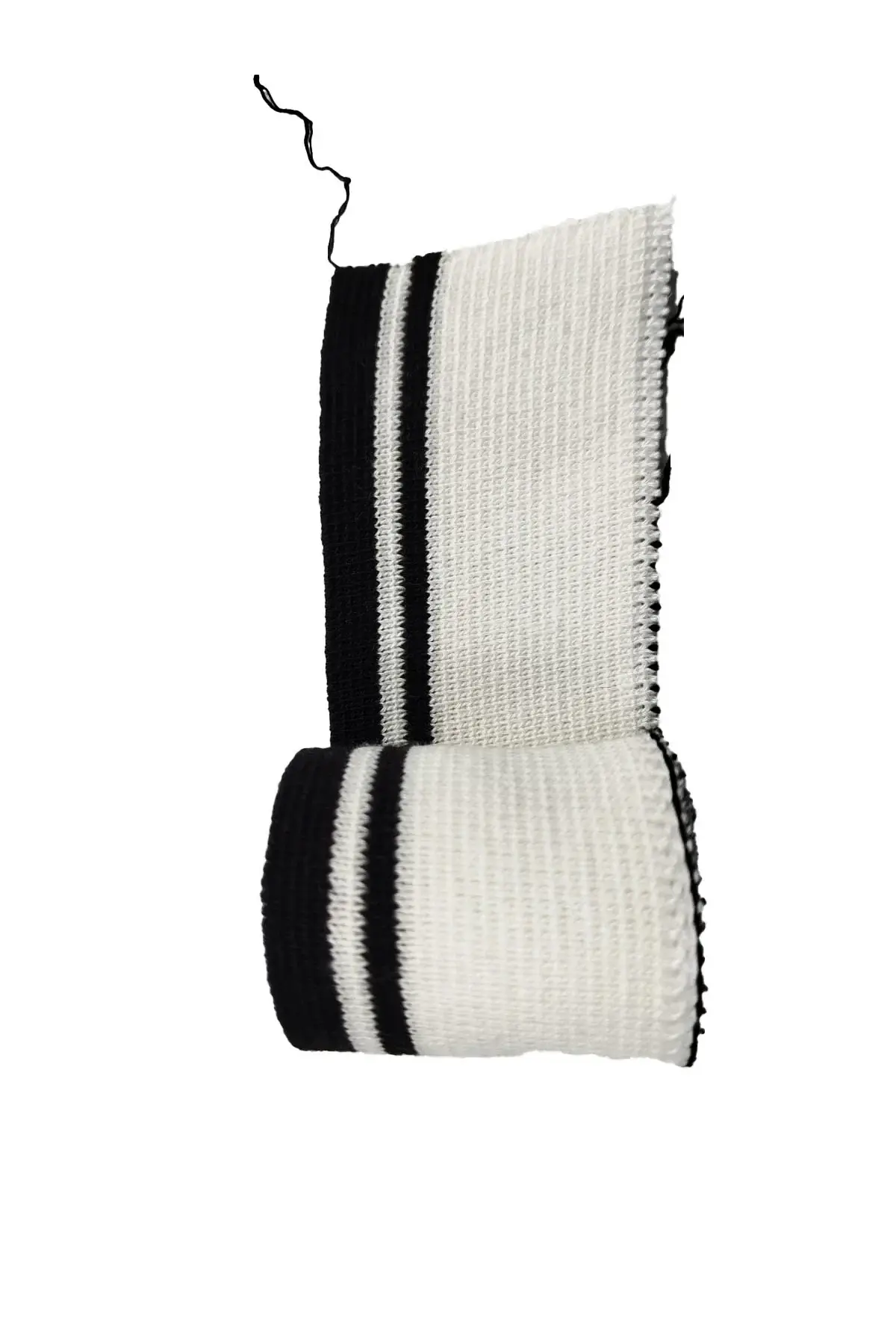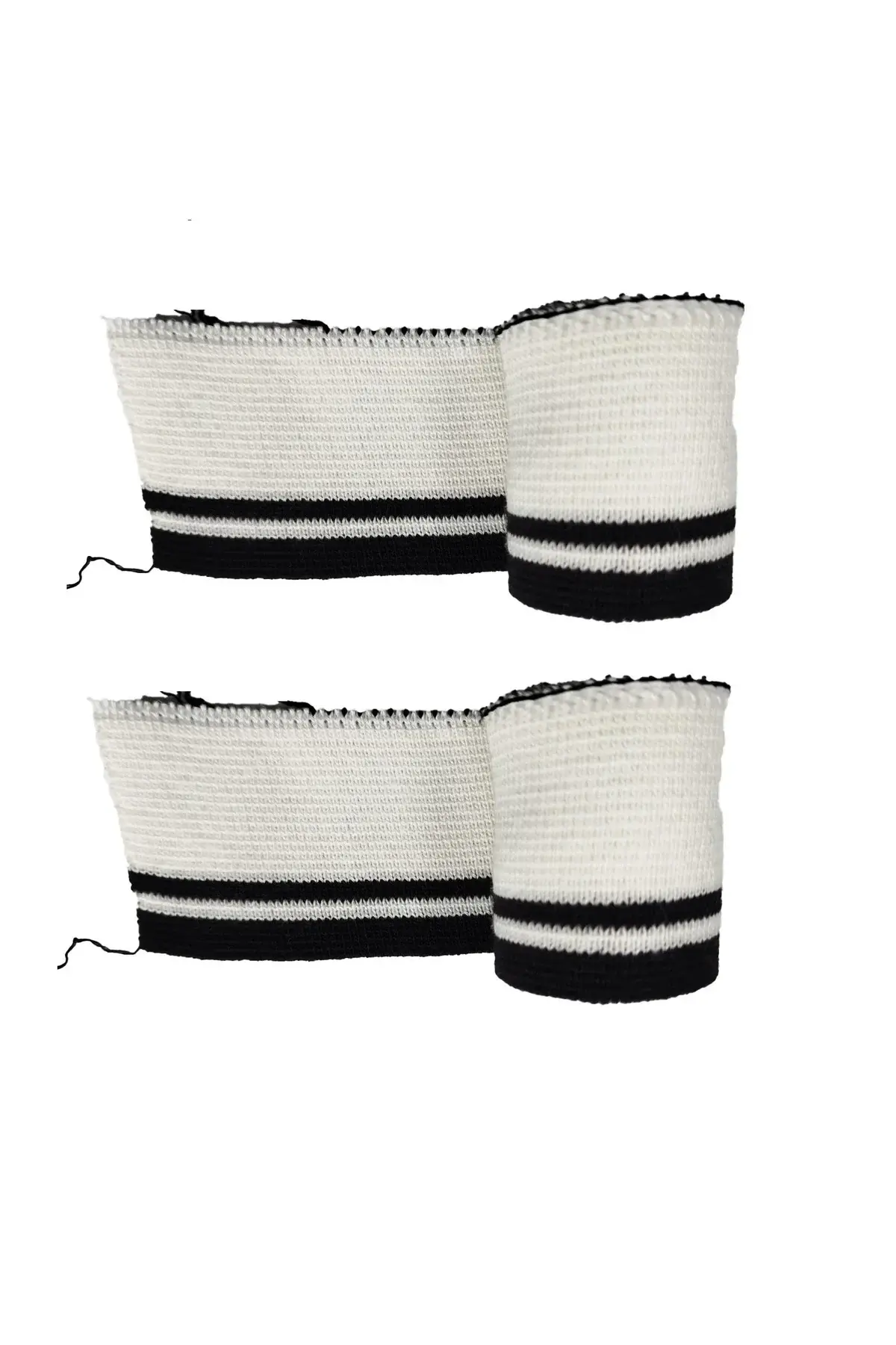 Beyaz zemin üzerine siyah çizgili triko ribana bant, iki taraflı kullanıma uygun dokuma yapısıyla üretilmiştir. Elbise onarımı, tasarım ve tamirat projelerinde kenar destek veya tamamlayıcı malzeme olarak kullanılabilir. Ürün eni 85 santimetre, boyu 4 santimetredir.